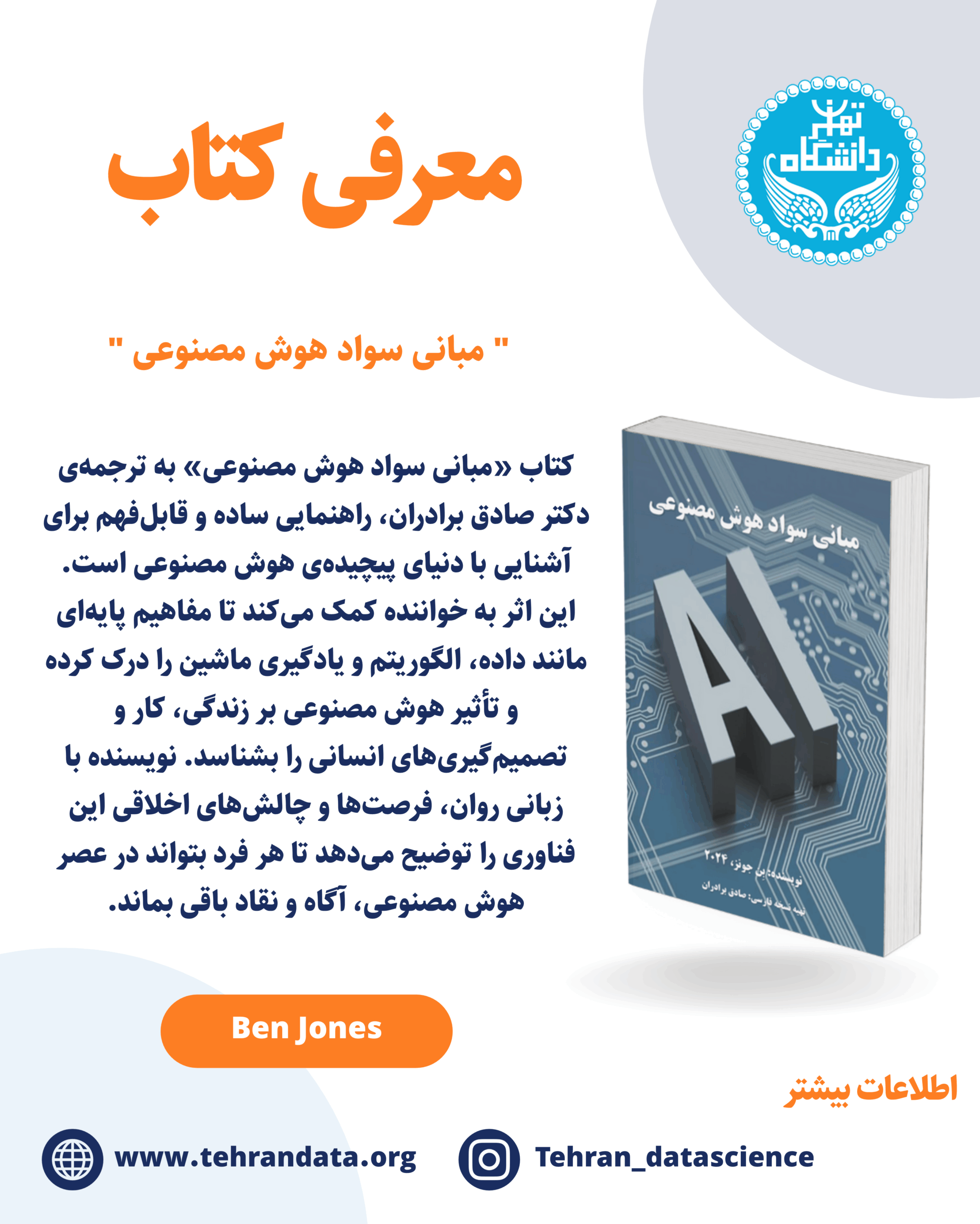 کتاب «مبانی سواد هوش مصنوعی» اثری آموزنده و الهامبخش است که هدف آن افزایش درک عمومی از مفاهیم بنیادین هوش مصنوعی (AI) و تأثیر آن بر زندگی انسانهاست. بن جونز در این کتاب با زبانی ساده و مثالهای کاربردی، دنیای پیچیدهی هوش مصنوعی را برای همه قابلفهم میسازد. این کتاب نه تنها برای متخصصان فناوری، بلکه برای همه افرادی نوشته شده که میخواهند درک درستی از تأثیر AI بر جامعه، شغل و آینده خود داشته باشند.